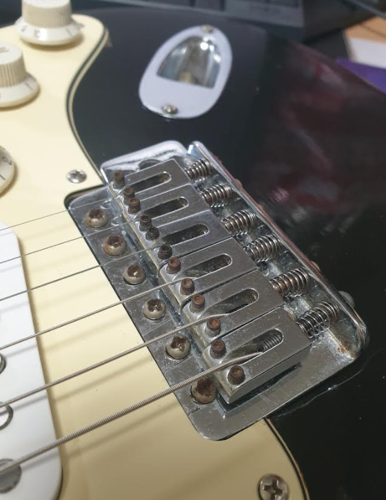 이래서는 연습이고 뭐고 다 레스폴로 해야 할 판이지만, 현재의 주변 환경 조건이 막 던져놓고 연습할 전투형 기타가 필요한데 레스폴은 생긴것과 다르게 견고한 맛이 없어서(넥뿌라던지 피니시의 갈라짐이라던지 현재 문제되는 17번 프랫 1번줄 버징 문제라든지), 결국은 신규로 트레몰로 브릿지를 하나 장만 해서 교체하는 것으로 결론을 내리고 몇 만원 수준의 가장 기본적인 레벨의 트레몰로 브릿지를 수배했다. 윌킨슨 호환 빈티지 계열의 트레몰로 브릿지. 사실 줄이 얹혀지는 모양새가 뭔가 딱 고정된 것 같지 않아 저런 형태의 새들을 싫어하는데 판매 가격이 내 취향을 이겨버린 경우가 되겠다. 써 보다가 안되면 유사 간격의 모던형 새들로 변경 해 보든지;;;