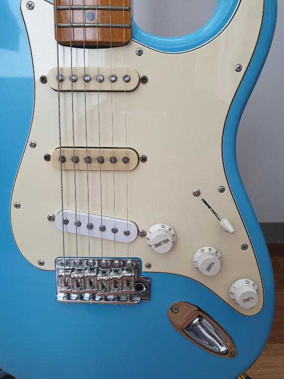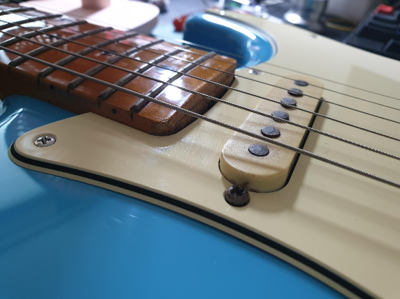 교체된 부분 중심으로 자세히 보면, 낡을대로 낡은 넥/미들픽업 제외하고는 완전 환골탈태 했다고 이야기 해도 좋을 정도이다. 구매했던 아이보리 톤/볼륨 노브는 색을 깔맞춤한 것 보다 기존의 흰색 부품들이 좀 더 자연스러운 느낌을 주는 것 같아 원래 파트를 그대로 두기로 결정.