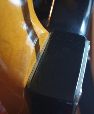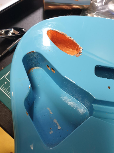 24프랫에서 끊어낸 흔적이 더 잘 보이기는 하지만 비교적 안정적으로 넥포켓에 안착. 당장해 내야 하니 방법은 없고, 기존 픽업의 나사구멍을 줄로 열심히 갈아서 넓혀줌...그렇게 해도 나사의 길이가 짧아진 반면 나사구멍의 위치와 픽업의 높이는 변함이 없어서, 픽업을 아래로 내리는 데 한계가 있다.
