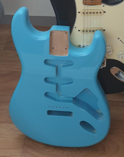 일단 싱-싱-싱 구조 및 6나사 트레몰로 브릿지 사양의 전형적인 스트랫 바디이다. 나사선은 넥 접합부와 브릿지 장착위치 외에 하나도 작업이 되어있지 않다. 픽가드나 잭포트 부분은 다른 부품들을 많이 사용하므로 그렇다 손 쳐도 브릿지 고정용 스프링 고정부 - claw라고 하는 - 과 접지를 위한 구멍이 없고 잭포트와 전장부를 연결하는 부분도 역시 뚫려있지 않다. 내가 뚫어야 한다는 것.