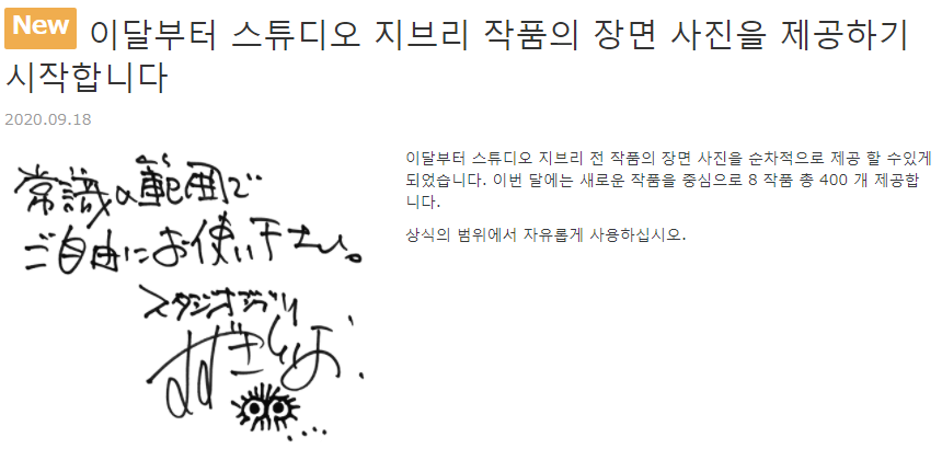 구글크롬으로 일-->한 번역해서 한글로 뜨는거임. 착오 없으시기를. 스튜디오 지브리에서 애니에서 나왔던 스틸컷을 고화질로 제공한다고. 비교적 최근작품들 위주로 보지 않은 것들이 대부분이지만 - 그래도 센과 치히로, 포뇨, 게드전기(...)는 본거네 - 다른 작품들도 순차적으로 제공한다고 하니 지브리 작품 좋아하는 사람들은 참고할 만 하겠음.