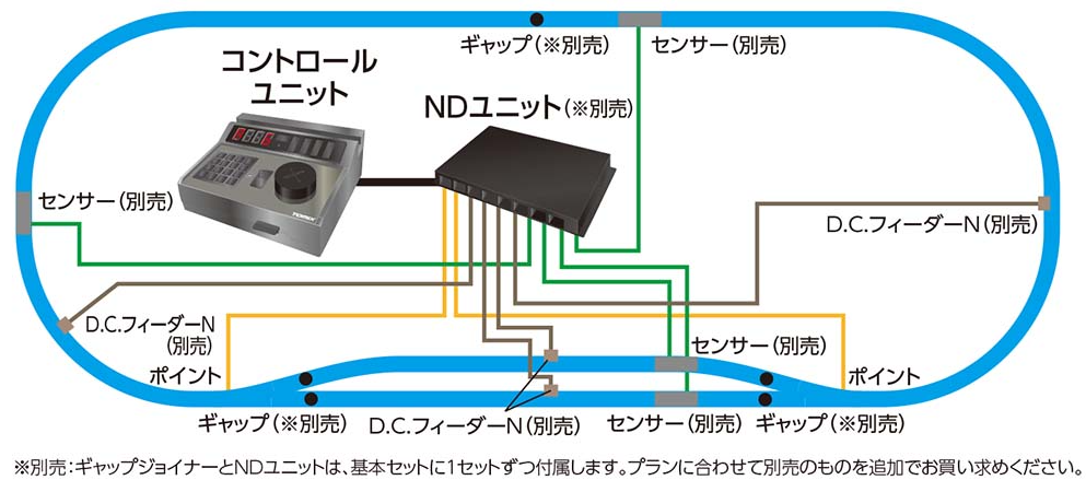 P2: TOMIX 제품만 사용할 경우 TCS/TNOS 등 독자적인 시스템으로 신호기, 자동 건널목 포함한 다양한 레이아웃을 비교적 쉽고 간단하고 편리하게 구성할 수 있음. 컨트롤러 하나에 레일 전원뿐만 아니라 센서류 등의 전기와 신호도 함께 연동이 가능 (하단의 검은 점이 절연구간, 회색 부분이 센서, 그리고 각 절연구간 사이마다 별도의 전원이 들어가면서 소위 '구간운전' 방식으로 다수의 편성을 조종하게 됨).