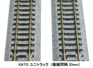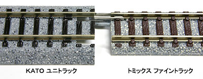 KATO (유니 트랙)은 도상의 폭이 넓고 침목도 길기 때문에 선로의 모양이 실감납니다. 복선 간격이 토믹스 파인트랙보다 좁아서 방바닥 운전을해도 그럴 듯 합니다. 반면 도상이 넓기 때문에 소형 포인트의 분기를 사용하려면 일반적인 선로를 그대로 연결할 수없고 별도로 제공된 "보조 선로"를 이용해야 합니다(* 분실하면 따로 구매 할 수 없다 함).
