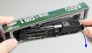 차량의 파손을 막기 위해, 기관차는 우레탄이나 스티로폼 케이스 등에 빈틈없이 끼워져 있습니다. 케이스에서 꺼낼 때 모형이 걸려서 부품이 부러지지 않도록 충분히 주의하십시오. 예로써 증기기관차의 경우 아래 사진과 같이 디플렉터를 잡고 꺼내면 디플렉터 자체나 장착 부품 등을 손상시킬 수 있으므로 절대 이렇게 하면 안 됩니다.