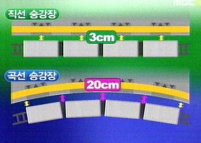 이 때, 곡선의 안팎으로 차체가 크게 벗어나므로(선로는 곡선, 기차는 16~20m 1량의 직선이 여러개 모인 다각형. 거의 대부분 곡선 플랫폼을 갖고 있는 지하철 역을 상기해 보면, 대체로 플랫폼과 차량의 간격이 넓음), 제작한 홈과 정차한 차량 간 간섭이 나지는 않는지 확인하면서 만들어주세요.