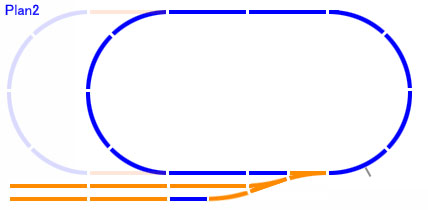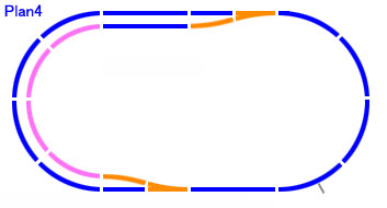 앞서 설명했던 플랜은 오른쪽 포인트 선로 2 개를 사용했습니다만, 이 것은 좌/우 방향의 포인트 선로 각각 하나씩을 사용합니다(포인트 선로 모양을 자세히 비교 해 보세요). 본선 아래에 직선으로 뻗어있는 2 개의 긴 인입선에, 열차를 한 편성 씩 - 예를 들어 여객열차와 화물열차 각 1편성 씩 - 주기 해 둡니다. 우선 객차가 출발하여 본선으로 입선 후 몇 바퀴를 돌고 역에서 승객을 태우고 싣는 등 여려 작업을 한 이후에 다시 원래의 인입선으로 돌아옵니다. 이후에 포인트 선로를 전환하여 반대편에 주기하고 있던 화물열차가 출발, 본선으로 입선하는 운전 패턴의 구현이 가능합니다.