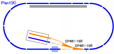 전에 소개했던 무한 원형레일 기본 세트 내측에 포인트선로를 추가해서, 기관차 2 량이 주차를 할 수 있는 기관고(차량기지)를 만들기 위한 계획입니다. 첫 번째가 토믹스(T), 두 번째가 KATO(K)로, 주요 부분의 예시만 보여드립니다. 파란색 라인은 원래 기본세트에 포함되어있는 레일이며, 오렌지 선로는 추가로 구매하여 더해야 하는 것으로써 동일 방향으로 분기되는 포인트 선로 두 개(R)를 사용하였습니다.
