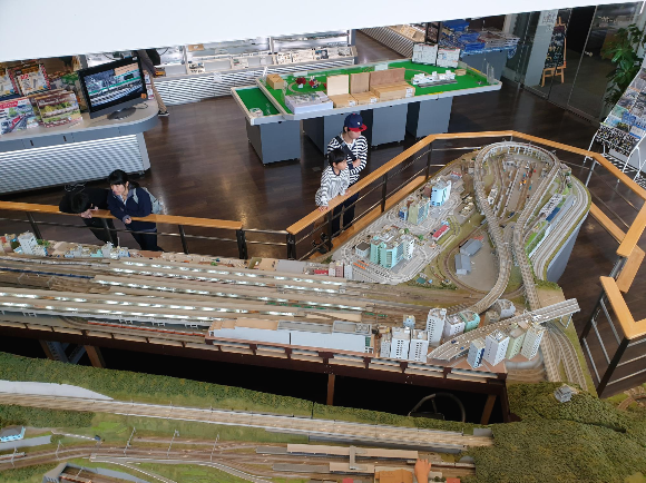 쇼핑몰 입구에 위치한 거대한 레이아웃. 사진에서 보이는 것은 부분일 뿐. N게이지 레이아웃을 중심으로 바깥으로 HO게이지의 큰 기차가 돌아다닌다. 느긋하게 레이아웃을 보고 있노라면 컨디션 유지를 위해 열심히 거대한 면봉을 들고 다니면서 선로를 닦아대고 있는 직원들을 볼 수 있다. 2층에 올라가면 자신이 가지고 있는 철도모형을 직접 운전해 볼 수 있는 거대한 레이아웃도 대여할 수 있으며, 가끔 아마추어 유저나 작가들의 레이아웃들도 구경 해 볼 수 있어서 레이아웃 꾸미기에 많은 공부가 된다.