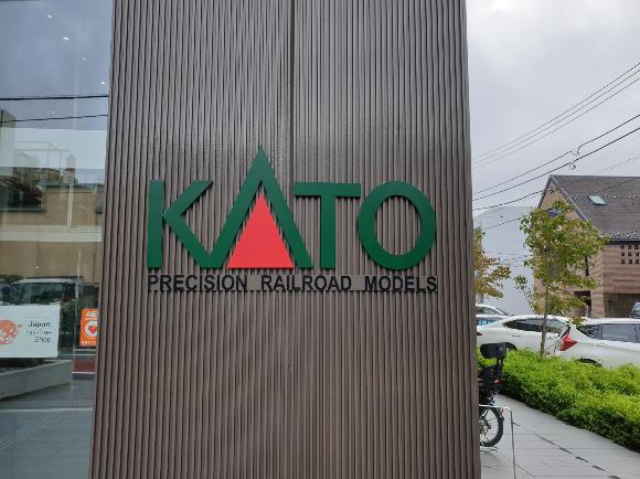 카토 본사의 간판. 입구를 통과해 바로 질러가면 본사 사무실로 들어가는 문이 있고(출입금지), 좌측에는 철도모형을 취급하는 쇼핑몰이 있다.