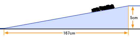 3% 기울기를 유지하면서 5cm 높이에 이르려면 얼마의 거리가 필요할까요? 5cm는 3cm의 약 1.67 배이므로, 수평 거리도 1.67배로써 약 167cm가 되겠습니다. 만약 다다미 한 장 크기(약 180cm X 90cm) 레이아웃의 원형트랙 일부를 입체교차시키려고 하면 경사를 오르는 레일을 꾸미는 것만으로도 공간이 부족하게 될 수 있으므로, 안정적이고 차분한 레이아웃을 만들 수 없습니다. 작은 공간에서 무리는 금물입니다.
