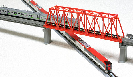 기본 선로에 경사를 오를 수 있는 받침대를 자작해서 입체교차가 있는 레이아웃을 만들 수도 있습니다. 그러나 도상이 있는 기본 선로를 받침대만으로 입체교차를 만들어서는 실감 나는 레이아웃을 꾸미기 쉽지 않기 때문에, 고가교 모양의 선로와 전용의 교각이 구비된 디오라마 세트를 구입하면 편리할 것입니다. 당연히 2 대 종합 메이커인 KATO와 토믹스에서 각 선로 시스템에 맞는 입체교차 세트를 다음과 같이 출시하고 있습니다(해외직구 이용하면 4~5만원대에 겟 할 수 있는 찬스가 가끔 있음).