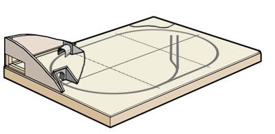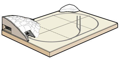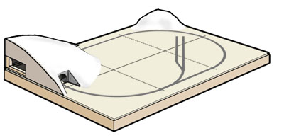 작은 산은 스티로폼을 여러번 깎아내어 만들 수 있습니다. 조금 더 큰 산은 적당한 판자로 내벽을 만들고 신문지 뭉치를 그 사이에 구겨 넣은 뒤 두꺼운 종이 테이프 나 철사 등을 그 위에 감아 붙여서 산 모양의 뼈대를 만듭니다. 철망 등을 붙이는 방법도 있지만, 이 정도의 소형 레이아웃에서는 잘 사용하지 않습니다. 뼈대의 표면에는 나중에 목공본드 희석액을 함침한 신문지나 석고 등을 발라서 산의 표면을 만드는데, 능선보다 뼈대를 5밀리 정도 높게 만들면 산의 둥그스름한 모양이 잘 잡힙니다. 그림에서는 생략되어 있지만, 다음의 석고 작업 전에 신문지 등을 이용해서 선로가 오염되지 않도록 선로 위에 마스킹 작업을 합니다.