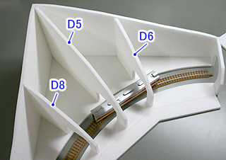 그다음 D12 ~ D14를 붙입니다. 최종적으로는 이 파트들의 앞에 판지 (P1 ~ P3)를 D15~D18면에 맞추어 비스듬히 붙여서 콘크리트 벽을 표현할 예정이므로, 이 벽은 가려질 예정입니다. 보강재로 삼각 판 D17 · D18을 바닥 파트 D2 위에 붙이고, 터널 포털 옆의 보강용 삼각판 D15 · D16은 바닥판 D2의 측면에 접착합니다.