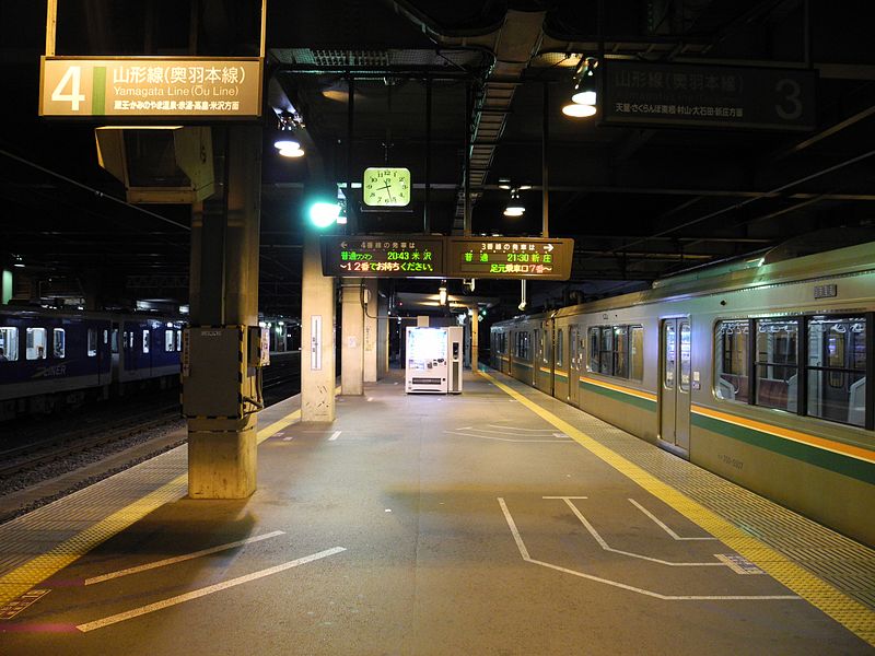 야마가타역 플랫폼 풍경. 4번선에 8시 43분 요네자와행 차량이 오려고 하고 있고, 3번선은 이미 신조에서 야마가타역으로 도착한 열차가 9시 30분에 다시 신조로 가기 위해 출발 대기 중인 것 같음. 왼쪽 기차는 지선인 아테라자와선의 후루티아 뭐시긴가 하는 네모네모한 디젤동차. (사진: 위키미디어 발췌)