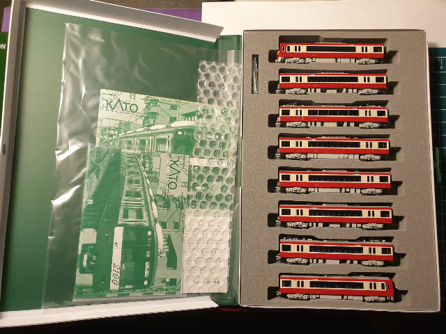 뚜껑을 열면 기본+증결세트에 각각 있던 설명서 두 개와 8량의 2100형 차량이 나란히 저장되어 있다. 붉은색 떡칠에 베이지색 라인이 정갈하다. 케이큐는 멋지니까 한번 더 확대.