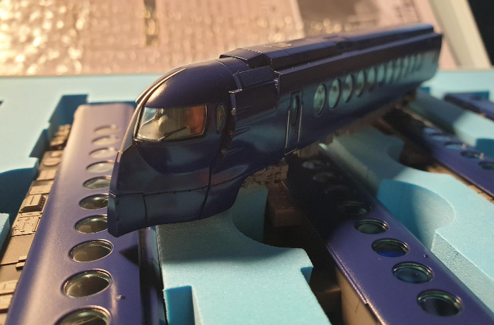 세트의 전체 차량을 한 번 훑어보는 것으로 마무리한다. 색상이 약간 보라색틱한데, 실제는 파란색이며 실내조명 때문에 그렇다. 도장할 때 출고 당시 유행했던 WRC의 스바루 임프레짜 WRX 색상을 참조했다고 한다. 5호차 모터 차량을 자세히 보면 모터 구동부를 어두운 색으로 쉐이딩 처리하여 착시효과를 일으키게 해 놓았으나... 표가 많이 난다. 참조로 자세히 보면 차량의 승객 출입문들이 어느 한쪽으로 치우쳐져 있는 것을 볼 수 있다. 내리고 탈 때 편의를 도모했다는데 잘 모르겠다;;;
