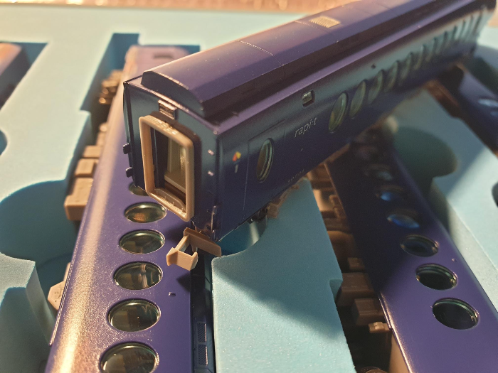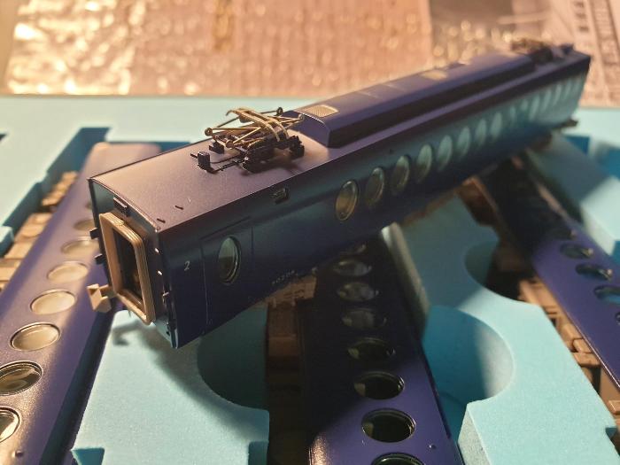 후면 연결부. 특급이라고 마이크로 에이스에서 특별 사양의 커플러를 장착하지는 않았고, 보통의 아놀드 커플러이다. 부자재가 준비되는 대로 카토 커플러로 전량 교체할 계획. 실내조명은 일단 차량 하나를 뜯어보고 토믹스 조명 설치가 가능하면 6개 1세트를 구매해서 장착해 줄 예정(요즘 직구몰서 계속 정가의 반값으로 할인되어 판매하고 있다).