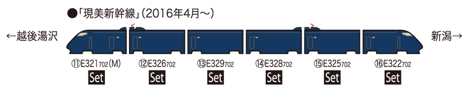 출처: 토믹스 홈페이지 Bookcase 1개 6량 단편성 세트이다. 뭐 어차피 스페셜 세트에 6량 밖에 되지 않으니 기본/증결로 나누는 것이 별 의미가 없는 차량이기도 하고, 그렇게 했다가는 상술이라 욕먹기도 딱 좋다. 왼쪽이 에치고 유자와, 오른쪽이 니이가타 방면이며, 역시 토믹스의 E3계 답게 좌측 1번 차량이 모터차가 되겠다. 뭐 다른 차량과 증결할 일은 없겠지만.