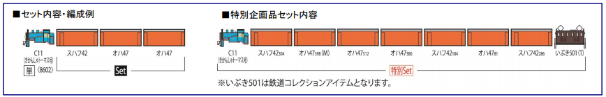 포인트 3) 이부키 501형(전기기관차)을 신규제작, deck 부는 일체 성형으로 난간 형상을 재현, 커플러는 토믹스 2축 화차와 동일한 구조를 채택 --> 특별기획품에만 포함되어 있으며 무동력, 동력 추가하려면 '테츠코레' 동력 세트를 별매 구입하여 조합 가능한가? 했는데 아닌 듯?