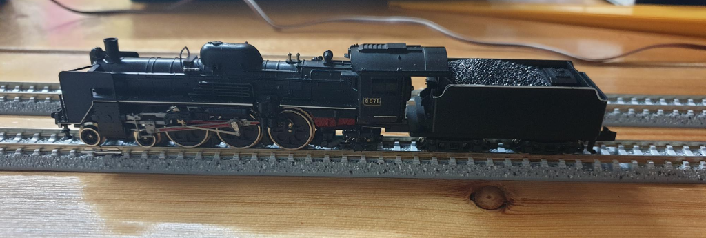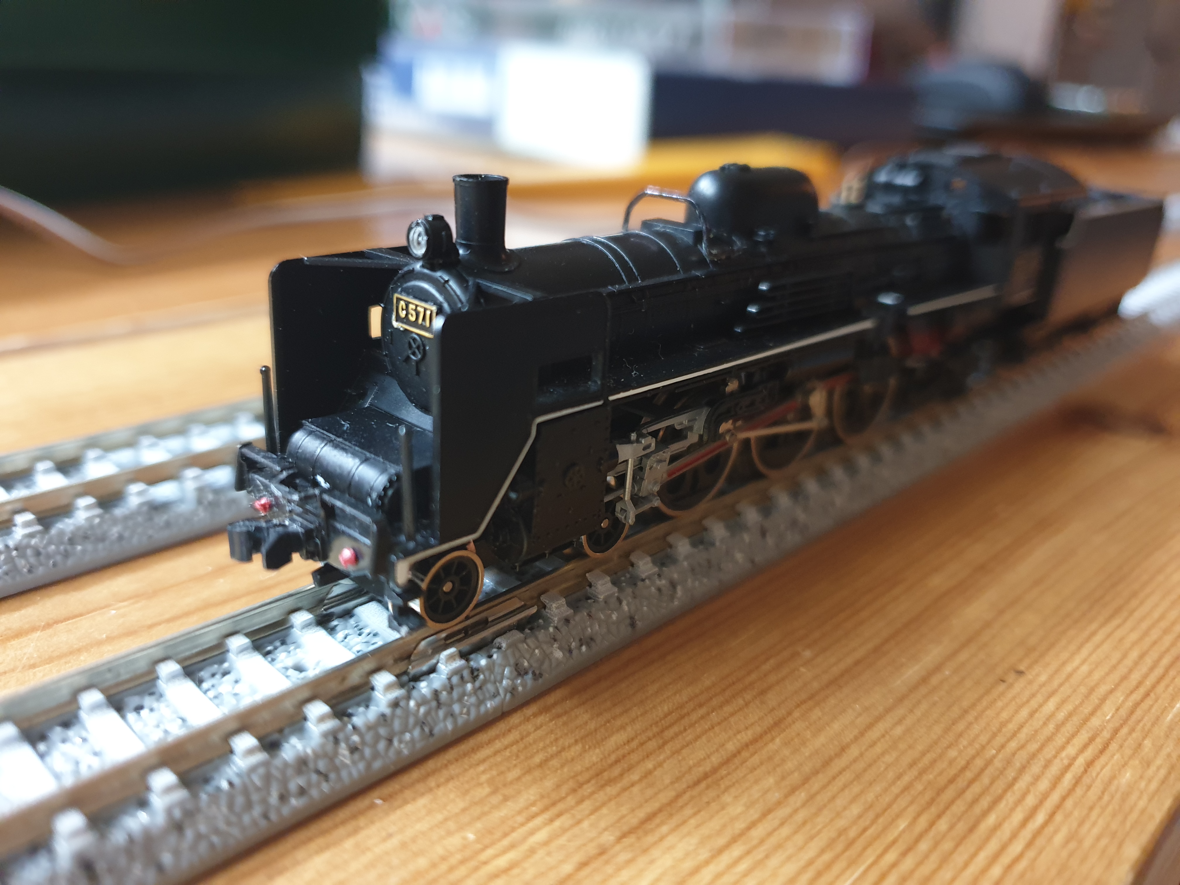 살 때부터 없었던 전방 커플러는, 가지고 있는 것에서 대체할 것을 찾다가 카토 커플러 N을 1/3 정도 두께 방향으로 깎아낸 후 전면 보드에 접착했더니 큰 위화감 없이 어울린다 - 대신 커플러 본연의 기능은 거의 없다 보는 편이 맞음. 커플러 양쪽의 빨간색 점 같은 것은 원래 케이큐 데하 268의 부품을 유용해서 포인트 삼아 그냥 붙여주었고(어차피 고증 따위 신경 쓰지 않음) 보일러 상단 돔 앞의 철사 구조물은 실제 차량에 보이는 것을 묘사하기 위해 달아 준 것으로 원래 본 모형에는 없는 것이다(신형은 있음. 아래 사진 참조). 호치키스 심을 사용해 구부려서 만들어 달아 주었다. 이 정도로 손을 봤더니 오래된 티가 나는 구형 C57-1이라도 현시점에서 다른 신형들과 같이 굴려도 모자라지 않을 정도가 되었다.