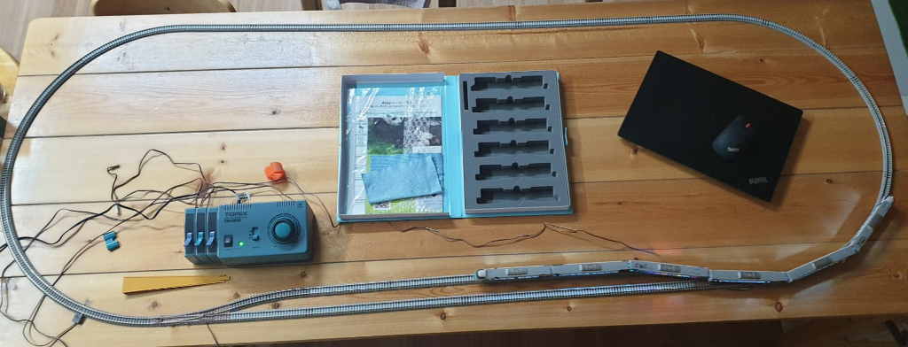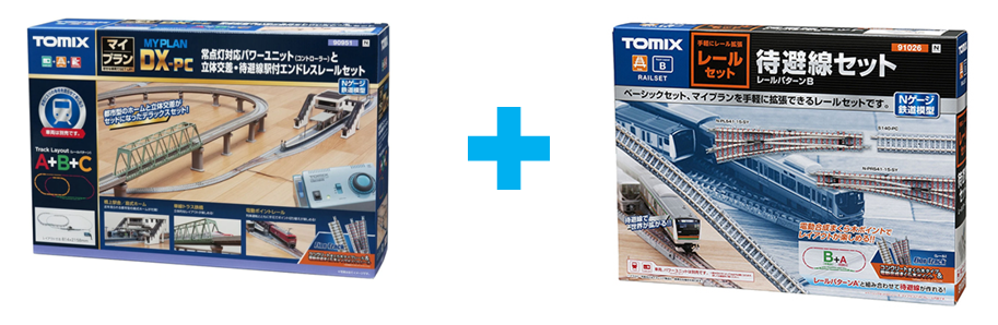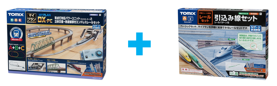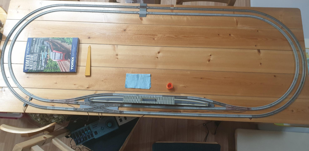 Tomix 90951 DX-PC set. A+B+C 조합 세트이다. 1001-CL 컨트롤러에 스위치, 역사까지 포함되는 혜자구성. 조금 더 욕심을 부려서 위와같이 입체교차할 수 있는 교각을 설치해서 규로를 확장하면 트랙에 고저차가 발생하고 선로간 층교차가 발생하므로 더 재미있고 역동적인 레이아웃이 되겠으나, 일단 식탁위에 놓을 수 있는 공간에 한계가 있고 - 교각 설치하려면 세로폭이 1m 넘어야 여유있음(814mm X 2158mm) - 이런 간이 레이아웃에서 교각과 입체교차 선로를 설치하는 것은 단순 평면 레이아웃을 설치하는 것에 대략 1.5배의 수고가 들어간다. 따라서 시간과 공간이 충분하고 설치와 해체가 용이한 환경에서 운용하는 것이 아니라면, 교각이나 입체교차 세트를 구입하는 것은 조금 더 많이, 신중하게 고민하고 진행하시기 바란다. 차라리 레이아웃을 더 넓히고 싶다면 고저차 없이 더 트랙의 범위를 넓게 벌려보는 것이 안정적이고 빠른 설치/해체가 가능하다. 단, 철도트랙 세트를 한 번 구매한 후 추가하지 않겠다 마음 먹으신 분께서는 위의 토믹스 90951 세트를 한 방에 구매하시는 것이 최선의 방법이겠다. 무한원형+대피선+입체교차까지 세트 하나로 한 방에 투자가 끝날뿐만 아니라 용량이 큰 1001-CL 컨트롤러에 스위치, 그리고 섬식 플랫폼과 교량형 역사 structure 까지 한 세트에 다 들어가 있다. 단선 편성이라 복선에 욕심이 생기며, 한 번 사는데 목돈이 들어가는것이 가장 큰 문제이다 - 쇼핑몰에 따라 20만원 후반부터 30만원 중반까지 가격 구성됨(제조사 정가 32,230JPY).