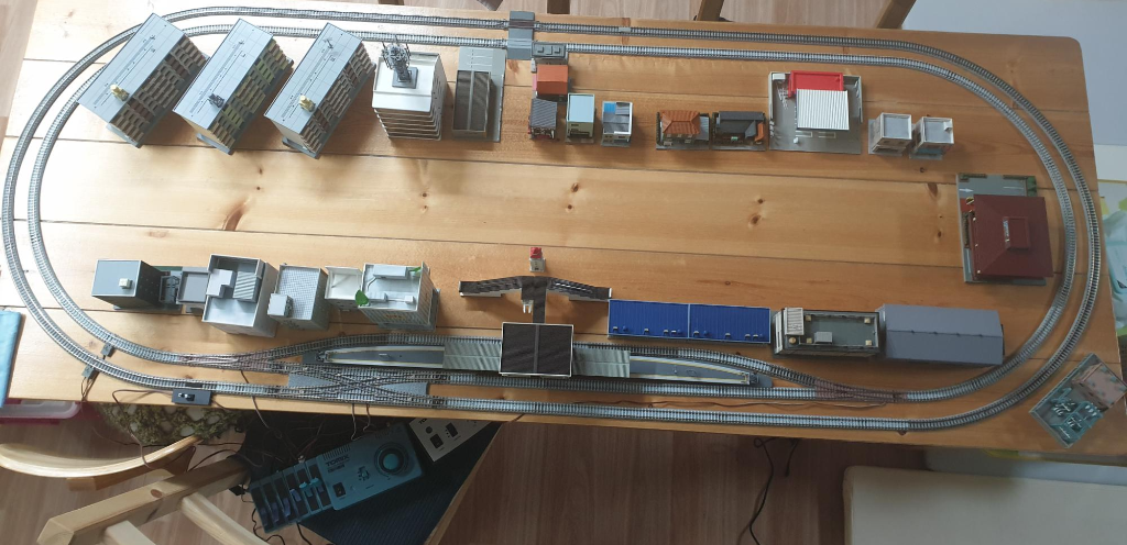 앞서 설치한 레이아웃에 섬식 플랫폼을 비롯한 역사, 건물들을 그냥 별 고민없이 세워보았다. 이 상태서 눈높이를 식탁 표면에 맞춘 뒤 철도를 주행시켜보면 레이아웃의 진가가 드러난다. 하지만 이 정도까지 설치와 구성을 하는 것도, 설치 하는데만 거의 1~2시간 소요되고 - 부품들 다 꺼내고, 선로 구상하고, 전선 연결하고, 잘 되는지 시운전 및 튜닝 시간 포함, 실제 모형을 트랙에서 부담없이 운전하는 시간은 얼마 되지 않는다. 해체하는 시간도 설치하는 시간에 못지않게 많이 소요된다는 사실도 알아야 한다. 정밀 부품이 많아 레고처럼 마냥 박스에다 섞어서 던져 넣을 수는 없으니까. 설치와 해체 과정이 주행을 즐기는 과정보다 더 길고 복잡한, 그야말로 주객전도 현상. 따라서 설치할 공간뿐만 아니라, 설치 후 운전, 그리고 해체에 소요될 시간까지 고려해서 어느정도 선 까지 레이아웃을 구성할지를 면밀히 검토 해 볼것.