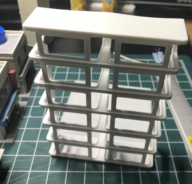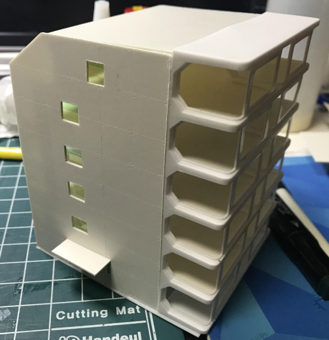 그렇게 제작된 뼈대를 기반으로 삼면에 건물의 벽체를 세우기 시작했다. 철근/콘크리트 건축물과 같은 질감을 주기 위해서 콘크리트 거푸집의 바둑판 무늬와 사면 점 같은 것들을 조각툴을 사용해서 음각해 주었다. 포맥스 재질이 스티로폼과 플라판의 중간 정도의 무르기라, 가공하기가 상당히 좋음. 벽체 세우기 전 각 층마다 조그만 쪽창을 뚫어 주었고 여기에 일차 투명 플라판으로 유리창을 만들어 주었으나, 너무 투명하여 내부의 부실한 구조가 그대로 드러나서, 유성 마카 사용해서 반 정도는 채색을 해 주었으나 여전히 어색하다.