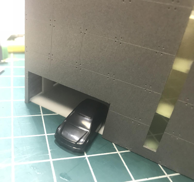 내부에 따로 계단 같은것을 만들지는 않았지만 실제 건물에 존재할 수 있는 계단룸, 혹은 엘리베이터의 쪽창을 세로 일자로 내어보았다. 왼편 아래에는 건물의 규모만큼 지하 주차장이 필요할 수 있을 것 같아 주차장 출입구도 만들어 주었다.