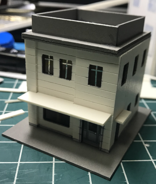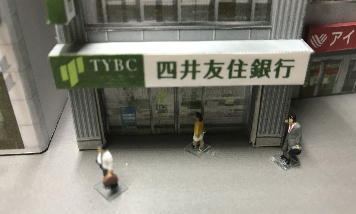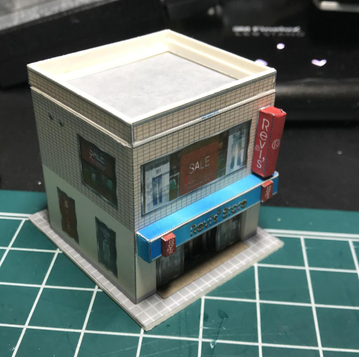 세븐일레븐 편의점 (토믹스제) 옆의 아웃렛 건물같이 생긴 옷가게 - 리바이스 짝퉁과 신사복 전문점. 그 뒤엔 학원 건물. 이렇게 시판되는 건물 모형 사이사이에 자작한 건물을 집어넣으면 큰 위화감 없이 잘 어울리는 것을 볼 수 있다. 뭣보다 건물들이 다 작은 데다 최근 프린터의 인쇄 품질들이 보급형이라도 다 좋기 때문에, 생각한 것 이상의 사실감을 얻을 수 있다.