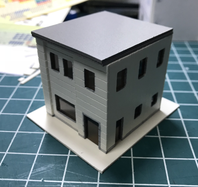 대략 완성. 일부 직접 그리거나 만들기에 디테일이 부족할 수 있는 부분은 아까 본을 뜨기위해 출력했던 출력물에서 일부를 잘라 붙여도 된다. 지붕 아래 보이는 현관문 같이. 필요하다면 벽면에 유성 마커 혹은 아크릴 물감 같은 것을 물에 얇게 풀어 채색이나 웨더링을 해 주어도 좋을 것이다.