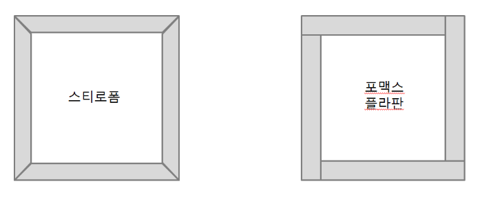 2. 적당한 두께감이 있는 포맥스, 스티로폼 등에 라벨용지로 출력한 도면을 부착한다. 단, 벽면과 벽면 끝이 90도로 붙는 부분의 공간을 잘 고려해야 한다. 일반 커터칼로도 잘 가공되는 스티로폼의 경우 아래 왼쪽 그림과 같이 맞닿는 면을 45도로 각각 비스듬히 잘라서 붙일 수 있으니 전개도 그대로 붙인 뒤 잘라서 뒤를 45도 파내면 벽면끼리 맞붙이는데 큰 문제가 없지만, 소재 본연의 강도때문에 사선 절단이 쉽지 않은 포맥스나 플라판의 경우 툴 덕후나 가공의 전문가가 아닌 이상, 아래 오른쪽 그림과 같이 직각으로 잘라 엇비슷하게 붙일 수 밖에는 없으므로, 사용하는 포맥스의 두께를 고려해서 라벨용지의 각 벽면마다 따로 잘라서 보드 위에 간격을 띄어 붙여야 한다. 다시말해 보드의 두께만큼 간격이 벌어지지 않도록, 한쪽 벽면은 라벨용지두께만큼 작게, 한쪽 벽면은 딱 라벨용지 폭 만큼 잘라내야 된다.