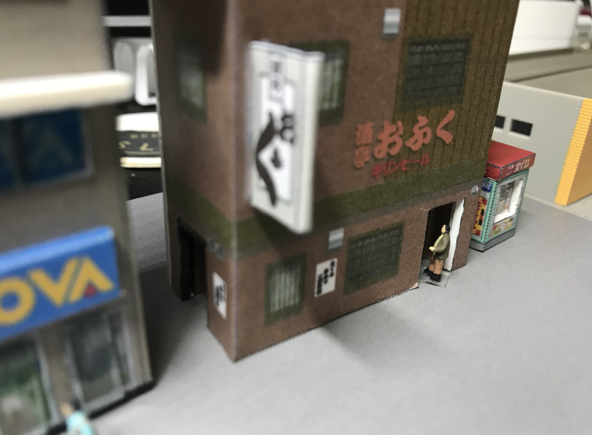 하루의 일과를 마치고 '오후쿠'라는 주점을 들어가는 배불뚝이 아저씨. 그 오른쪽은 복권을 파는 노점상 - 주점 좌측 입구의 경우 모서리를 검은색 매직으로 칠해서 위화감이 적은 반면, 오른쪽 입구는 흰색 포맥스가 그대로 노출되어 보기에 따라 어색할 수 있다. 이것도 갈색 마커 같은 것으로 처리해주면 좀 더 자연스러워지겠다.