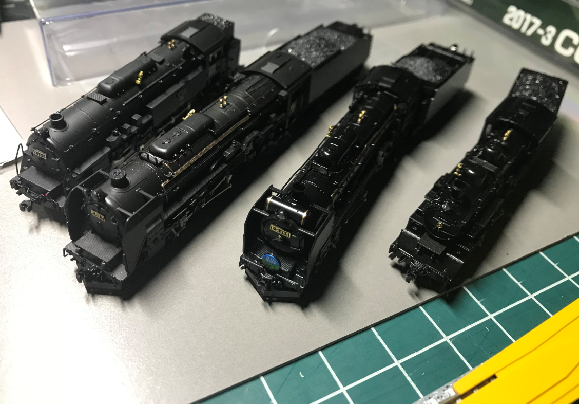 좌로부터 오후혼센 이타야고개 대응용의 E10-3, 홋카이도 니세코 견인용으로 유명한 C62-3, 아직도 동일본에서 현역인 D51-498, 그리고 카토 50주년 기념으로 출시된 유광의 C50. 이 중 E10은 무려 마이크로에이스 것임.