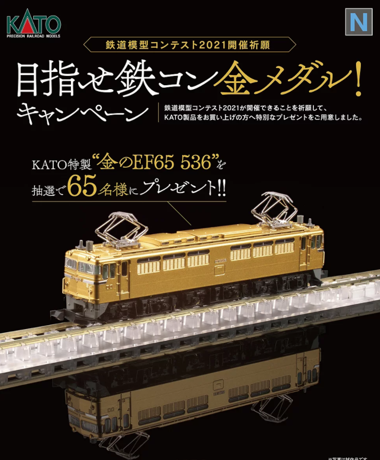 출처: 카토 홈페이지. 철도모형 콘테스트 2021이 개최되기를 기원하면서 KATO 제품을 구입하는 사람에게 특별한 선물을 준비했다고 함. 일본 전국 카토등록 판매점에서 카토 제품을 만 엔 이상 구매하면 응모권을 한 장 준다네. 추첨해서 총 65명에게 금색 도장한 EF65 536 (아마도 카토 공장에 얼굴만 잘려서 보관된 바로 그 차량을 모델화)을 선물한다고. 응모기한은 4월 말일, 당첨자 발표는 언제하는지 따로 이야기가 없다.