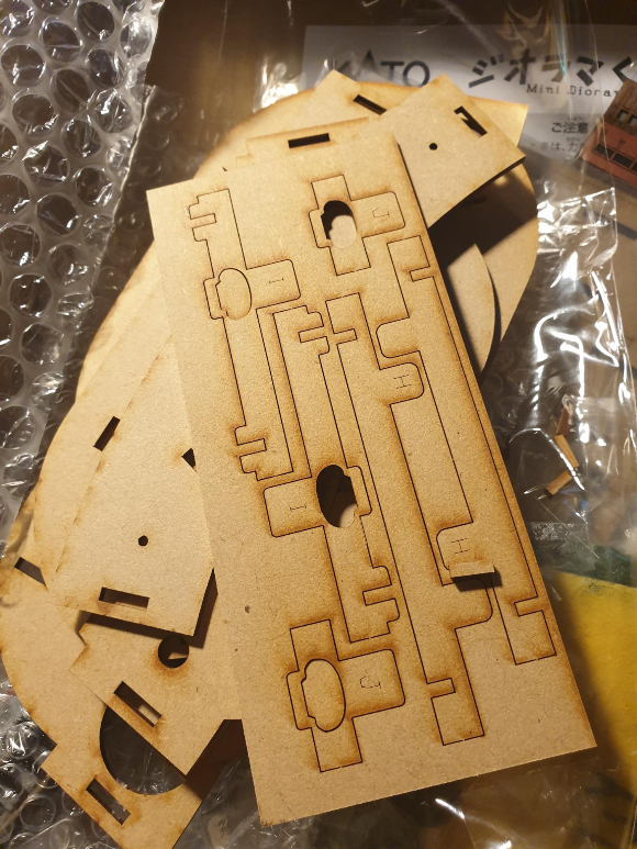 베이스패널은 당연히 원목은 아니고, 레이저로 치수대로 커팅된 3mm 짜리 베니어합판으로 되어 있다. 포장을 뜯는 순간 레이저 가공에 의한 나무 탄내가 온 방에 진동을 하는데 이게 은근 중독... 향나무 부채 펴고 흔드는 그런 기분이랄까. 커팅한 모든 부품은 별도로 뜯어낸 것이 없으니, 사진에 보이는 구멍을 일일이 다 때어주어야 한다. 뭐 힘들지 않으니 짧은 시간에 핀셋이나 드라이버 같은 것으로 다 제거해주면 됨.