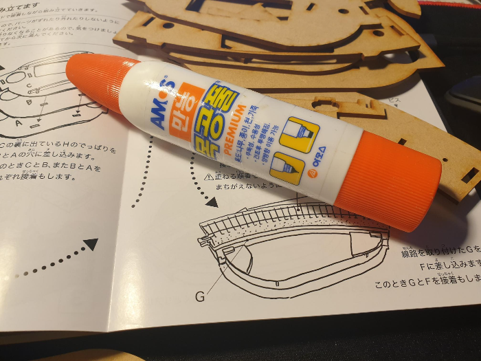 키트에 '스피드본드'라는 정체불명의 PVA계 접착제가 포함되어 있긴 하지만, 일단 나무 붙이는 것은 똑같으니 국산 아모스 '만능 목공풀'케이스를 이용한 오공본드제 목공풀을 사용하도록 한다. 목공풀의 장점은 나름 유독물질이 적을 뿐만 아니라, 칠하고 나서 굳으면 투명해지고 삐져나온 풀은 제거하기도 편하다. 다만 일부 피착재에 대해서는 접착력이 약한 단점이 있겠지. 하지만 목공 풀이니 베니어 합판을 붙이는 본연의 임무는 당연히 소화 가능.