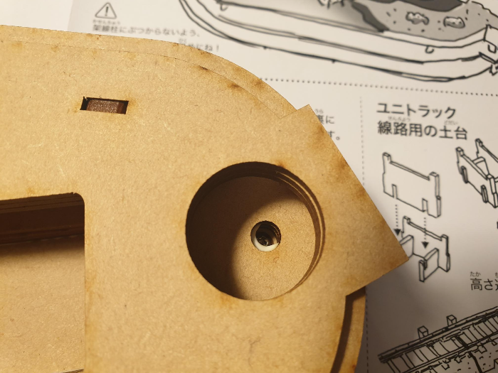 한 가지, 뒤집어보면 카토 유니트랙을 피스로 고정할 수 있는 구멍이 있다. 설명서에서는 유니트랙이 붙는 베니어합판을 베이스에 적층 하기 전에 피스로 박고 붙이라고 추천하고 있으나, 굳이 순서를 다르게 해도 문제없을 듯하다. 다만 저렇게 피스 구멍을 내어 놓은 것은, 조립할 때의 편의성 목적보다는 유니 트랙 자체 문제가 생겼을 때 교체를 편하게 하기 위해 만들어 놓은 비상구 같은 개념인 듯.