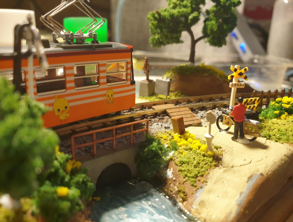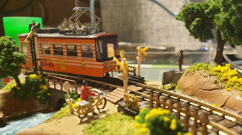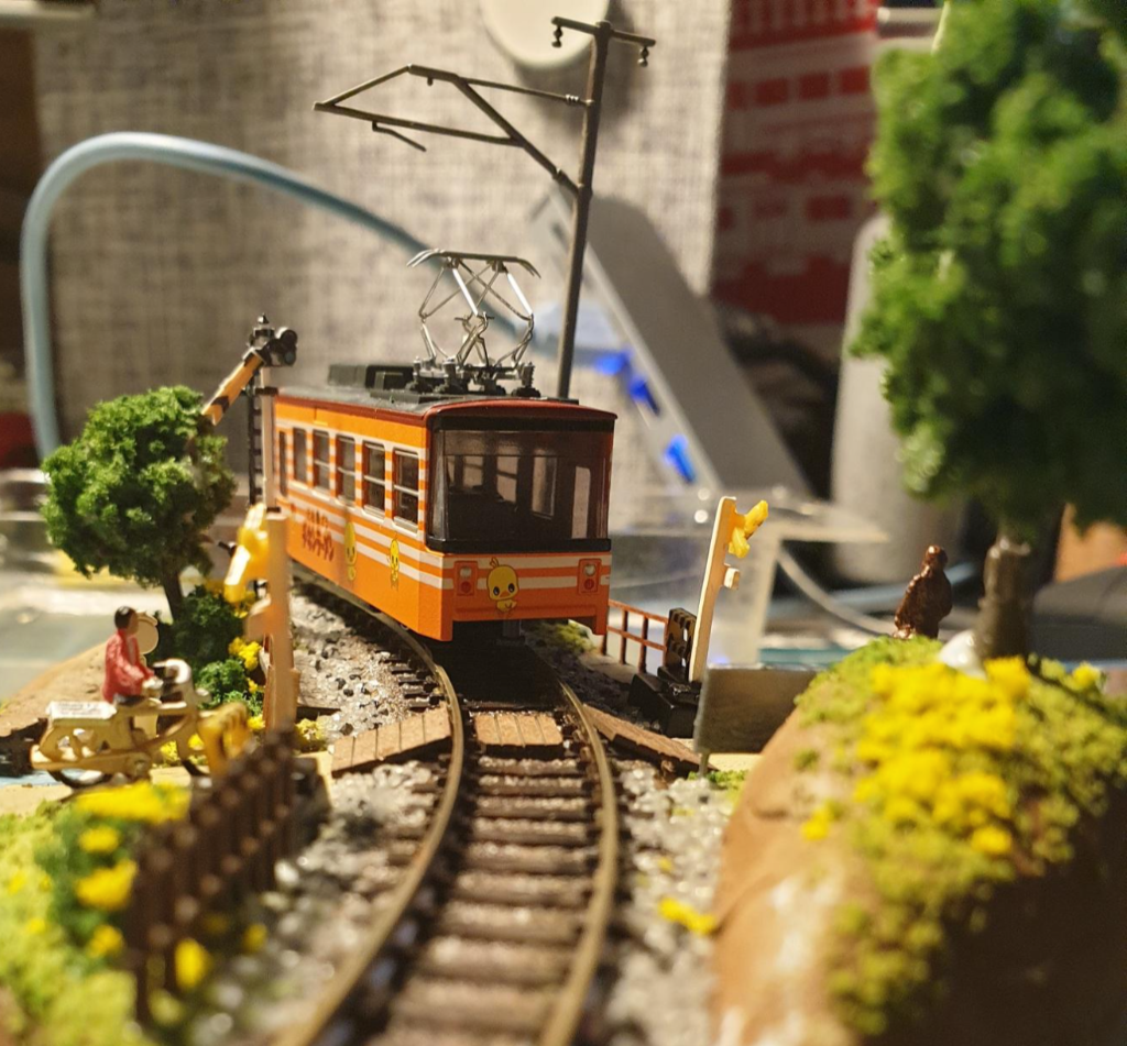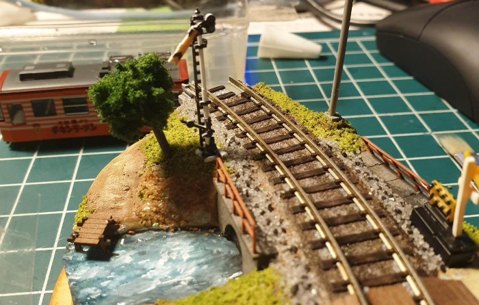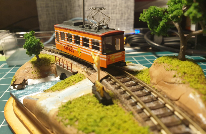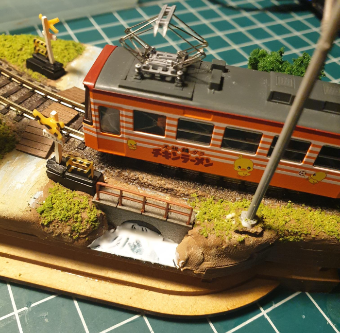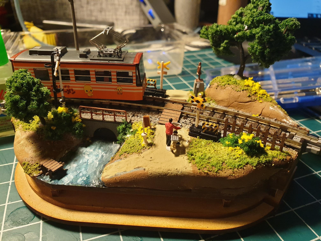 이후에 어울릴만한 차량을 얹어서 간섭나는 사물이 없는지 점검한다. 데하 268을 쓰려다가 그냥 카토 치비덴 '치킨라면호' 반만 걸쳐줌. 이게 이 디오라마에는 제일 어울리는 듯. 애기들이 건드려서 부서져도 부담 없고;;;