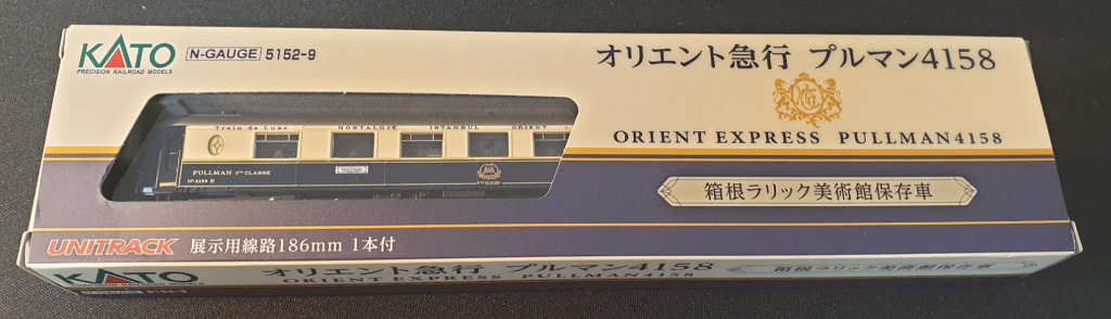 보통의 단품과 다르게 종이포장으로 구성되어 있으며 '오리엔트 특급 풀만 4158'이라는 제목에 '하코네 라리크 미술관 보존차'로 표시되어 있다. 내용물을 보면 차량 뿐만 아니라 이를 장식할 수 있는 186mm 유니트랙 선로가 하나 포함되어 있는데, 아쉬운 것은 대차에 브레이크 장치가 없어 경사진 곳에 전시하면 구를 수 있다는 것.