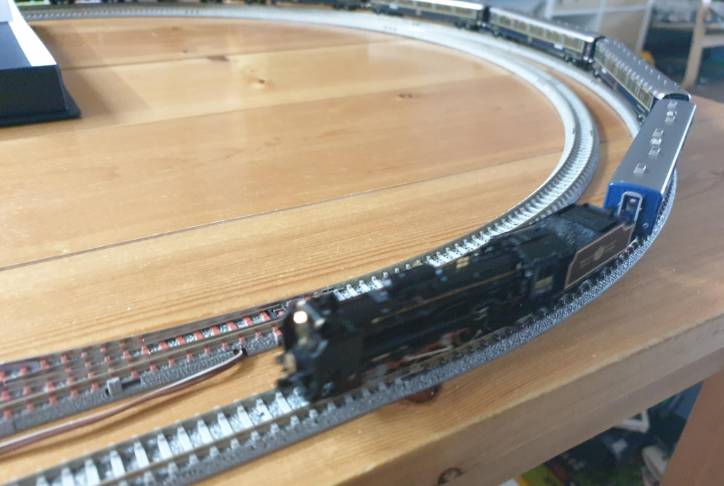 일전 설명드렸던 구성으로 풀 편성을 놓았을 때의 광경. 보시다시피 외측 선로의 반을 잡아먹는다. 따라서 기관차 포함 총 14량의 차량을 풀편성으로 돌려보기에 아무래도 한계가 많다. 모 제국의 공군원수같이 돈과 지위와 땅이 많으면 뭔들 못하겠냐마는 나는 거기에 시간과 상황이 안타까운 샐러리맨 나부랑탱이니까.