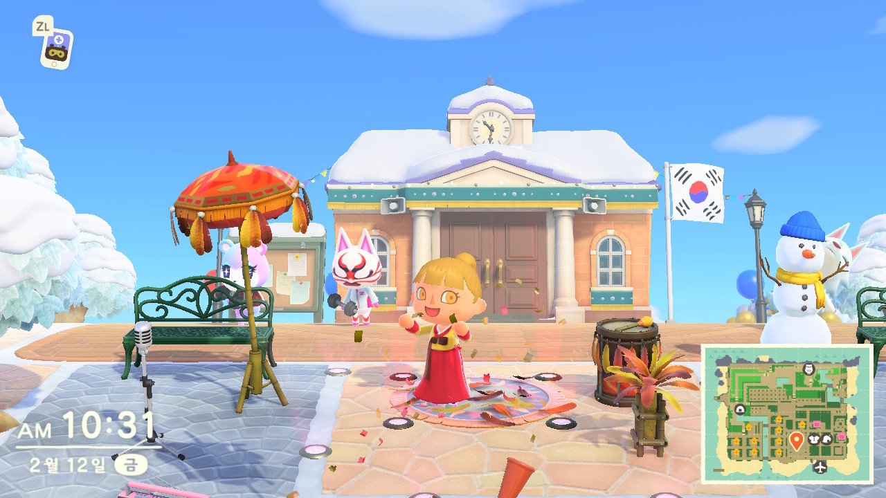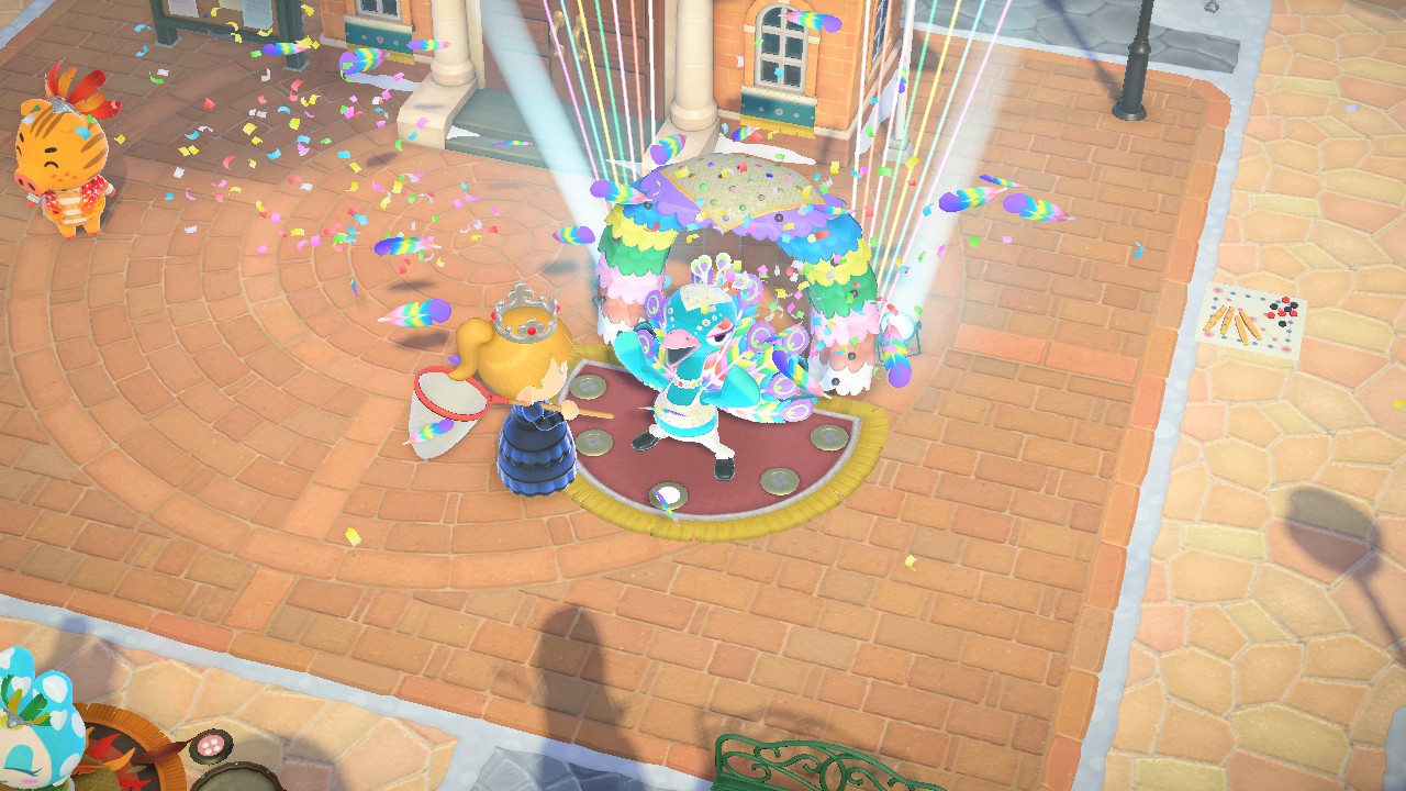 이후에 펼쳐진 카니발. 모동숲 제품이 일본과 서양쪽 중심으로 이벤트가 꾸며져 있음을 잘 알수 있는 그런 이벤트 중 하나였다. 날아다니는 깃털을 가져다 저 공작한테 갖다주면 춤을 추면서 뭔갈 주는 그런 방식. 환장 춤 이후에 저 화려한 조명 주변에 아무도 호응해주는 사람이 없는 것이 더 웃긴 시츄에이션.