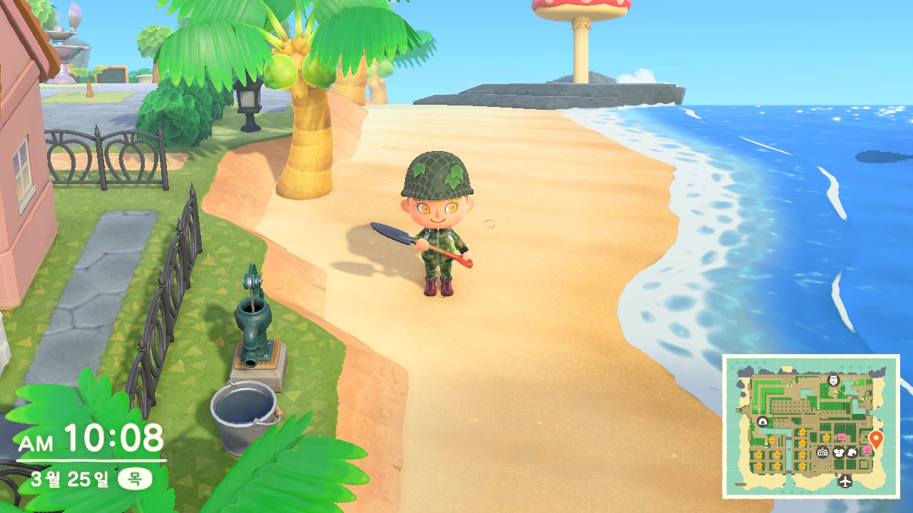 평화를 사랑하는 닌텐도에서 총/칼이 나올 수 없으므로 군인의 또 하나의 상징인 삽을 들고 밀리터리 코스프레를 하고 있는 중. 뭐 어떤 하드코어 유저는 섬 하나를 병영으로 만들기도 하더라만.
