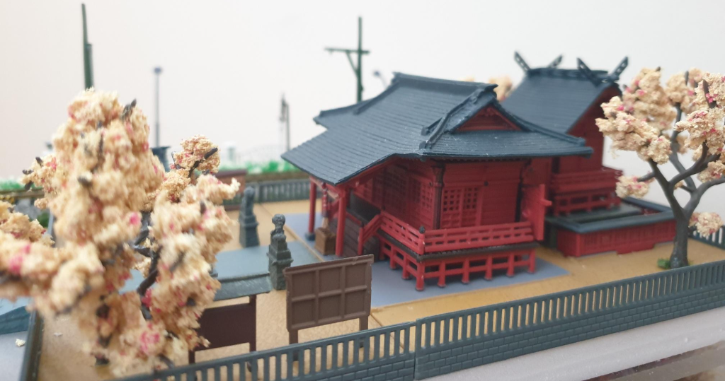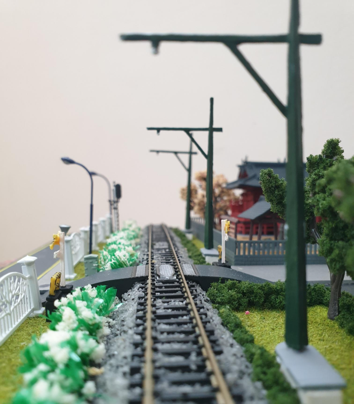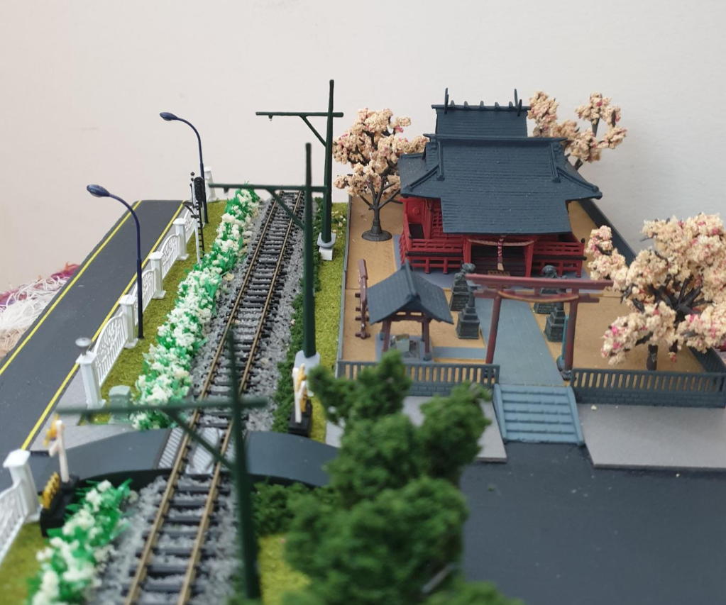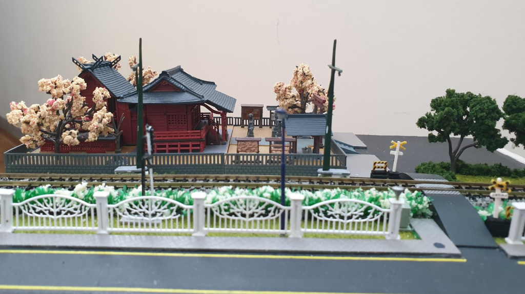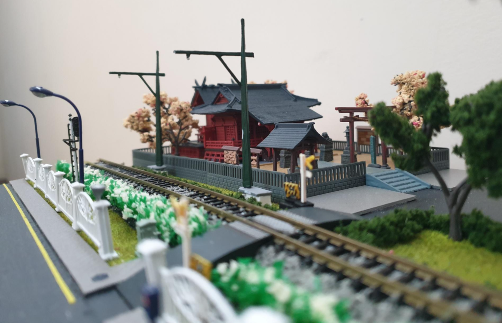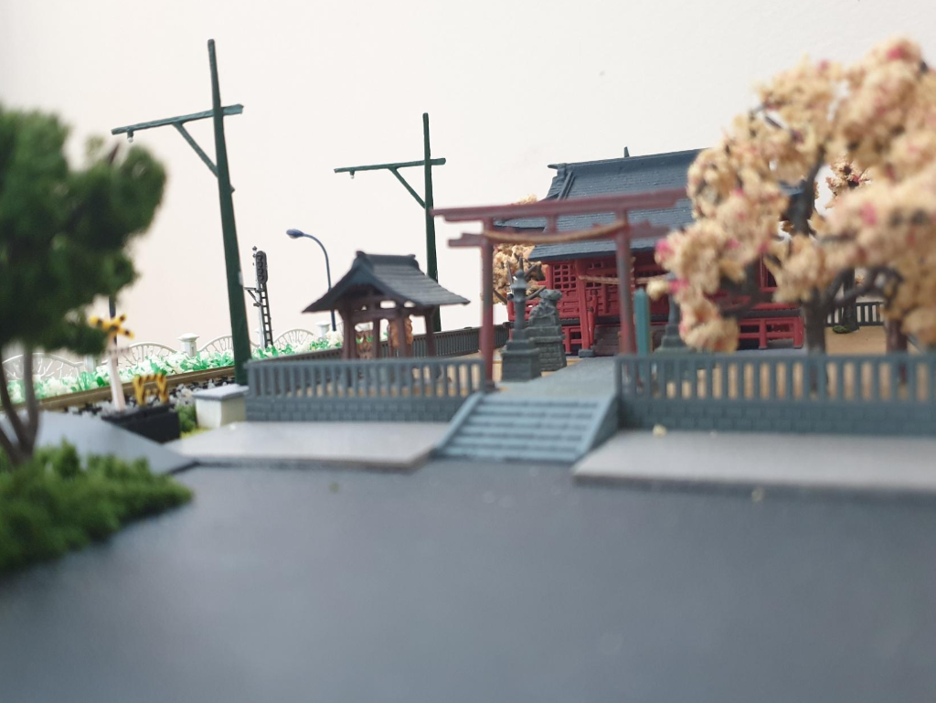 정경을 약간 틀어서 보면 앞에서부터 차례로 어떻게 제작되었는지 잘 알수 있다. 번화가 만큼의 북적거리는 유동인구가 지나가는 곳도 아닌, 그렇다고 마냥 외진 곳은 아니라는 어중간한 설정으로 제작한 것. 그래서 철도가 지나가는 도상 외에는 고저차가 없는 거의 평지이다.신사가 있는 위치에 단을 좀 올려주고 그에 상응하는 층계를 달아줄까 했으나 너무 거창해질 것 같아서 포기. 지금와서 보면 그렇게 해 주는 것도 나쁘지 않았겠다 싶다.