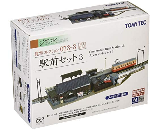 역 앞 정경. 역사 및 플랫폼, 역무원실, 화장실, 코반(경찰서) 등의 건물 뭉치는 토미테크의 073-3 '역전 세트 3'이다. 최근 색 놀이로 빨간색 지붕에 구성은 동일한 '역전 세트 4'가 나왔다. 것보다 이쪽이 좀 더 자연스럽기는 함. 역 주변 건물을 한 방에 구성할 수 있는 장점이 있다. 그 오른쪽 하얀 상자형 이층 건물은 일전 포스팅 주제로 다루었던, 페이퍼크래프트 건물 도형을 응용하여 포맥스로 제작한 자작 건물. 역 사무실 개념이라고 보시면 될 듯.