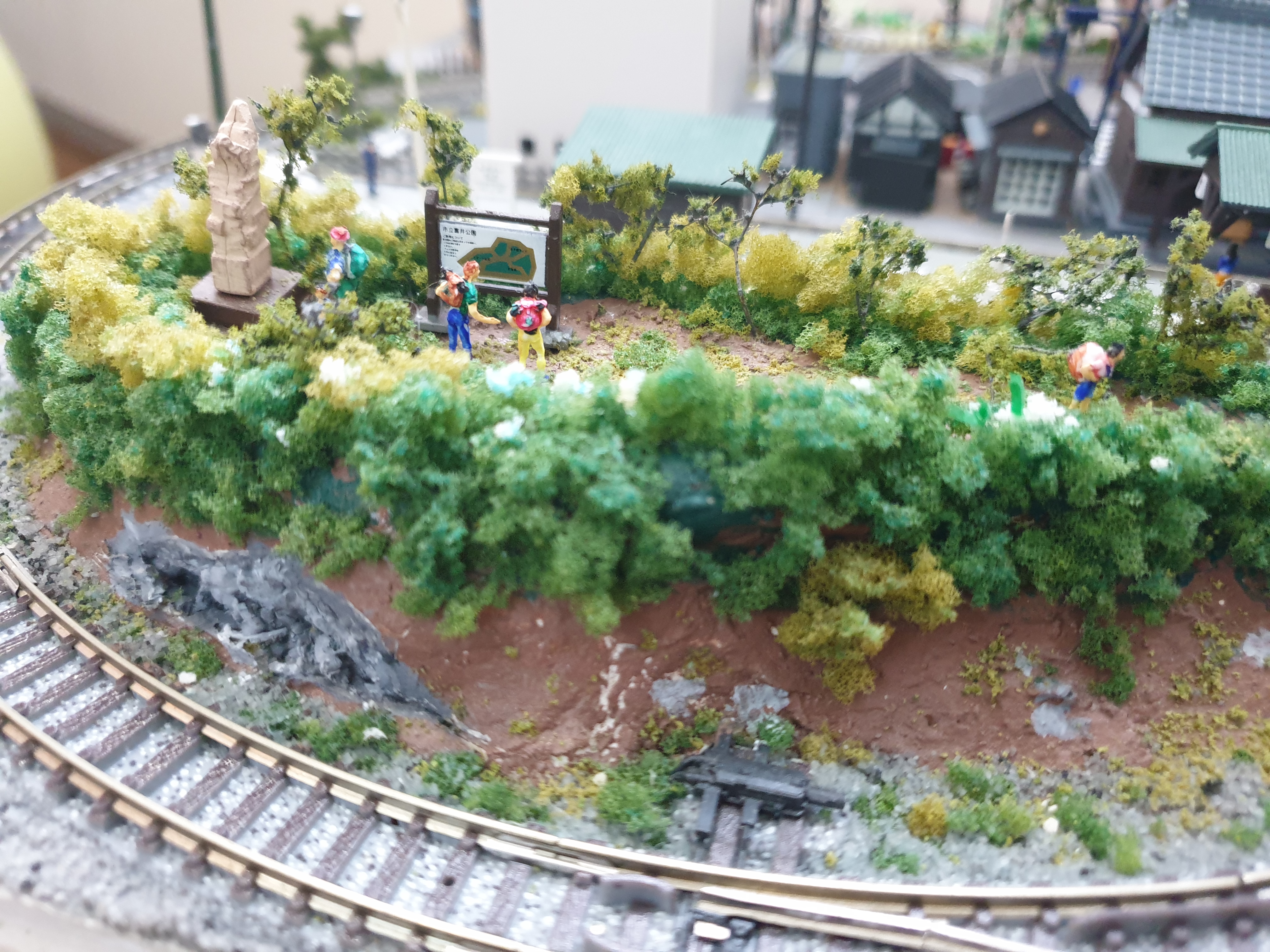 플랫폼 건너편에는 조그만 산언덕을 만들고 기념탑 같은 것을 세워서 뭔가 의미 있는 척하는 장소를 만들었다. 거기에 등산객 인형을 배치하여 관광지 같은 느낌을 좀 더 사실감 있게 부각. 뭐 실제로 보면 별거 없지만.