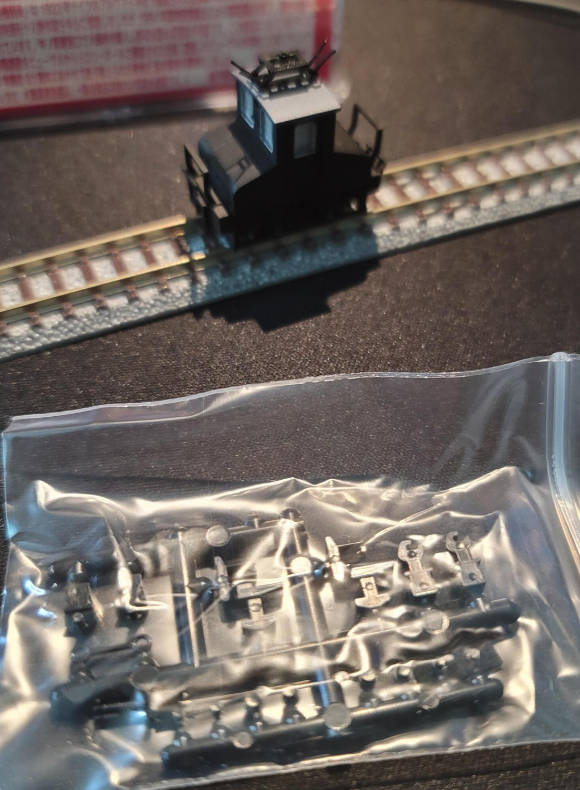 저 조그만 박스안에 들어있는 다양한 부품이 있는 런너. 차량에 비해 런너가 더 크다. 여기에 창틀 및 차량번호를 전사할 수 있는 인레타(인레타!!) 스티커등이 있다. 차량에 어울릴만한 소형의 객차도 츠가와양행에서 판매하는 것 같지만 뭐 거기까지는 필요 없을 듯 하고 갖고있는 치비덴 객차나 대차 없는 4륜 화물열차 같은 것을 견인하면 되겠다.