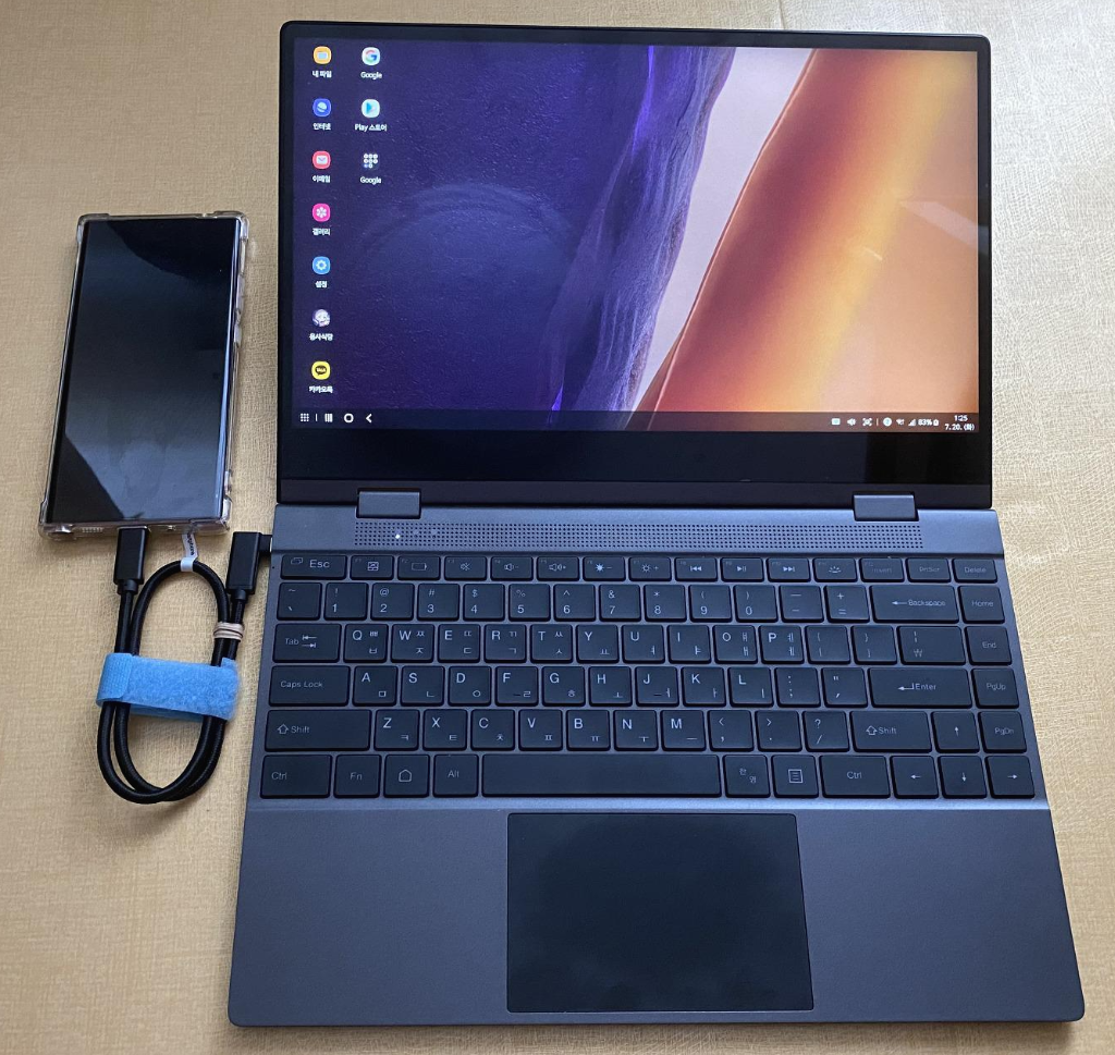 7. 많은 유저들이 불만인 'DEX 유선연결' 부분인데, 의외로 본인은 유선연결에 대한 불만은 전혀 없다. 과거부터 무선보다는 유선으로 확실히 연결된 것을 선호 해 왔고, 무선 접속이라면 본체와 플립북 사이에 생길 수 있는 랙(?) 이 성능에도 영향을 미칠 듯. 그래서 이런 장비는 유선이 좋다. 다만, 본체와 스마트폰을 덜렁거리는 선으로 연결하면 일순간 캐주얼하게 접속하는 것은 모르겠지만 갑작스런 작업공간 이동, 그리고 각 기기를 책상에 놓았을 때 정돈된 느낌이 없어 아무래도 불안하다.