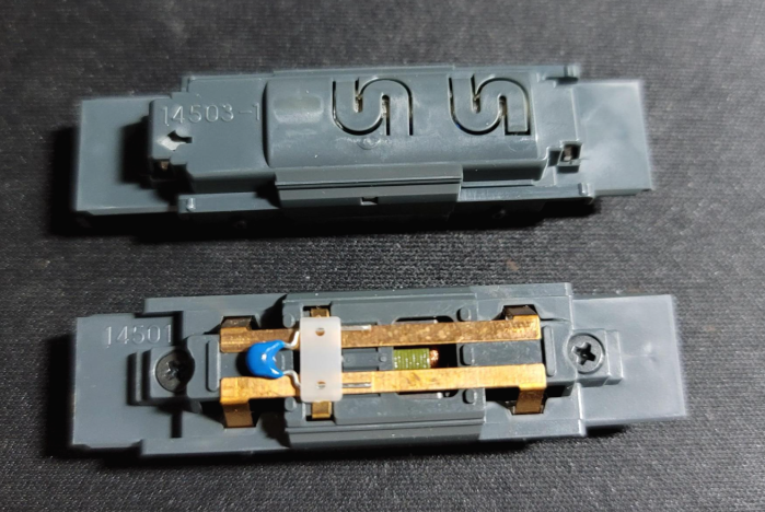 상단면을 보면 구제품은 배선이나 금속 단자 등이 노출되어 있으나 신품은 보시는 대로 플라스틱제 하우징에 감추어져 있다. 위의 S형 무늬는 어떤 기능을 가지는지 도데체 알 길이 없음.