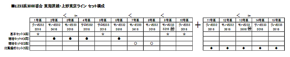 E233계 도카이도 우에노 도쿄라인 15량 풀편성. 이쪽은 M차가 각각 9호차, 13호차로 편성의 약간 뒤에 위치하지만, 그 거리가 비교적 멀지는 않다. 4) 출력이 넉넉한 컨트롤러를 도입하여 사용할 것.