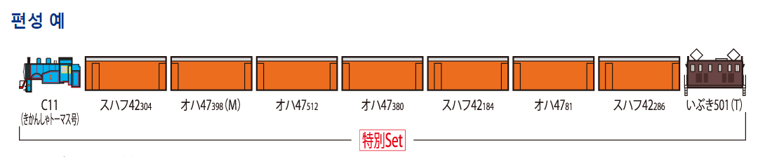 아래의 토믹스 출시 예정인 (9월에는 진짜 나올까...) 오이가와 철도 토마스호 full set를 보시면, 주력인 C11 기관차, 그다음 보조동력이 최후단의 '이부키501호' 전기기관차에 있지 않고 두 번째 객차인 '오하47 398' 에 있는 이유가 바로 그것이다. 심지어 '오하 47'은 C11과 속도 보조를 맞출 수 있는 출력 전환장치도 탑재될 예정이니.